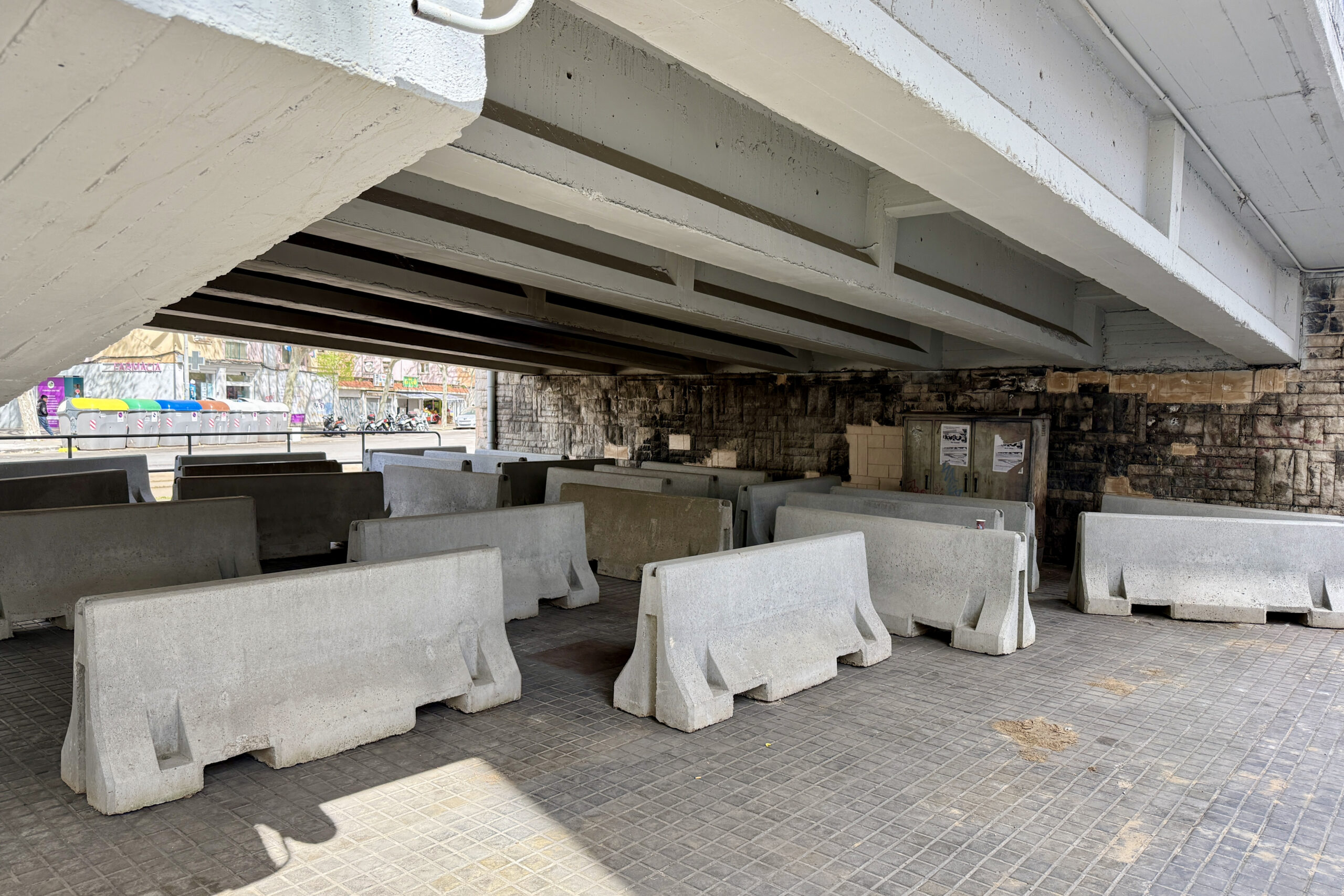 Bona part del sotapont s’utilitza ara com a aparcament improvisat, mentre que la zona més baixa, on hi havia l’acampada dels sensesostre és del tot impracticable per la presència dels blocs de formigó. N’hi ha 25 en total.