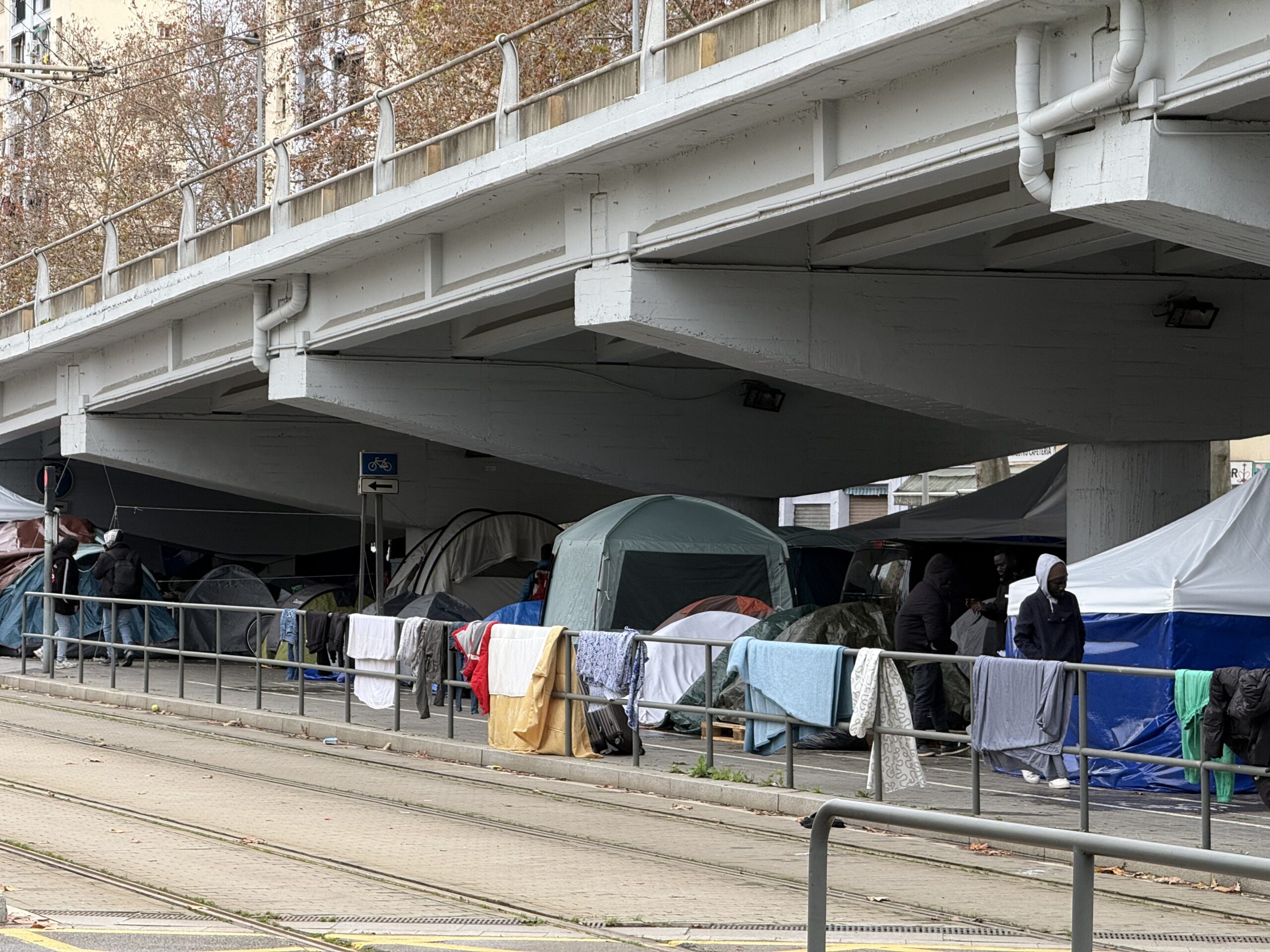 Sota la C-31 es manté els gruix de persones desallotjades de l’antic institut metre les entitats socials els busquen ubicacions alternatives. Una cerca que fins ara no està sent fàcil per la manca d’espais disponibles i per l’oposició veïnal. Aquest diumenge, per exemple, la pressió veïnal va impedir que una quinzena dels desallotjats poguessin passar la nit a la parròquia Mare de Déu de Montserrat.