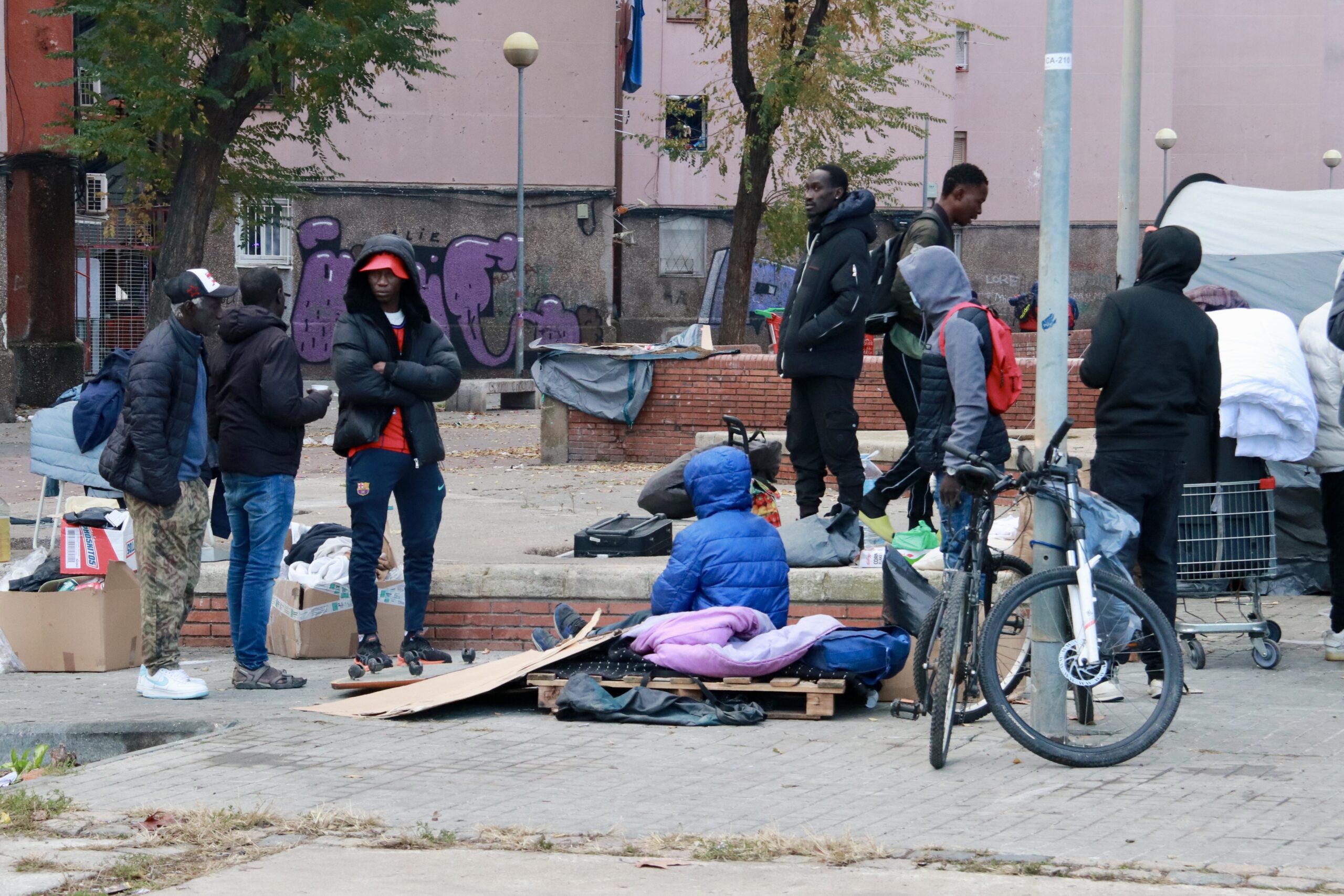 ACN Badalona – Els migrants han començat a desmuntar les tendes de campanya i a marxar voluntàriament de la plaça de davant del B9 on havien acampat després del desallotjament de dimecres. S’estan traslladant a pocs metres. Un dispositiu d’una quinzena de dotacions de la Guàrdia Urbana de Badalona, amb antiavalots, s’ha desplegat a les 7 hores i els ha donat de temps fins a les 10 hores per marxar voluntàriament abans de tornar-los a desallotjar. A aquella hora, la línia policial ha avançat, però els mediadors, del Sindicat d’Habitatge Socialista de Catalunya i de Badalona Acull, han demanat a la Guàrdia Urbana més temps. Els agents els ho han concedit i han relaxat la intervenció, retrocedint la línia policial. La brigada de neteja ha començat a actuar.