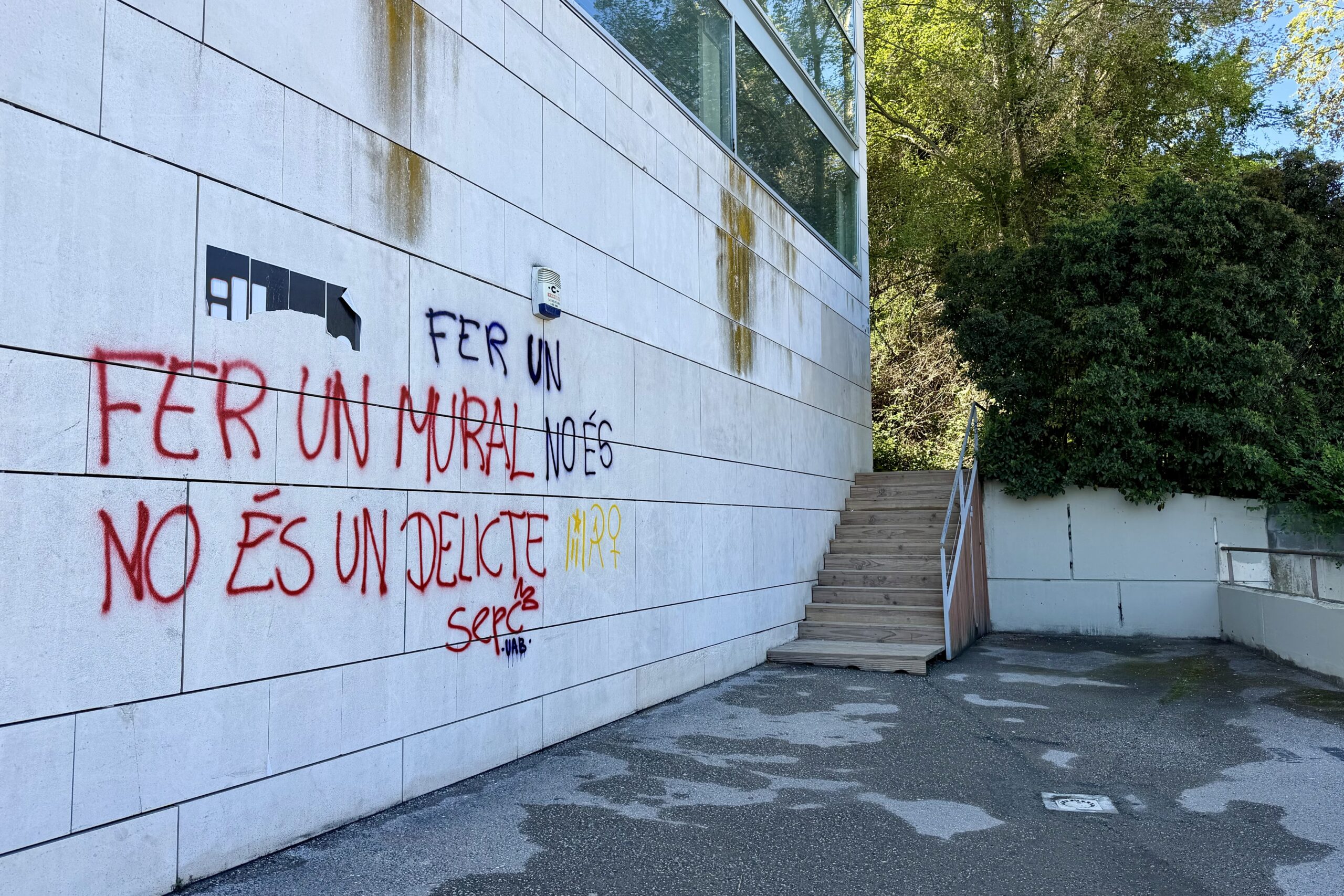 El mural ha estat durant anys presidint la gran paret situada a la plaça Cívica, en un dels laterals de l’edifici que acull la cafeteria principal i just a la sortida del vial que connecta amb l’estació dels Ferrocarrils de la Generalitat (FGC). L’entitat constitucionalista Impulso Ciudadano va denunciar l’any 2019 l’existència de la pintada, i el jutge va decretar l’any 2024 mesures cautelars que obligaven a tapar-la mentre no es dictava sentència, un fet que encara no ha passat.