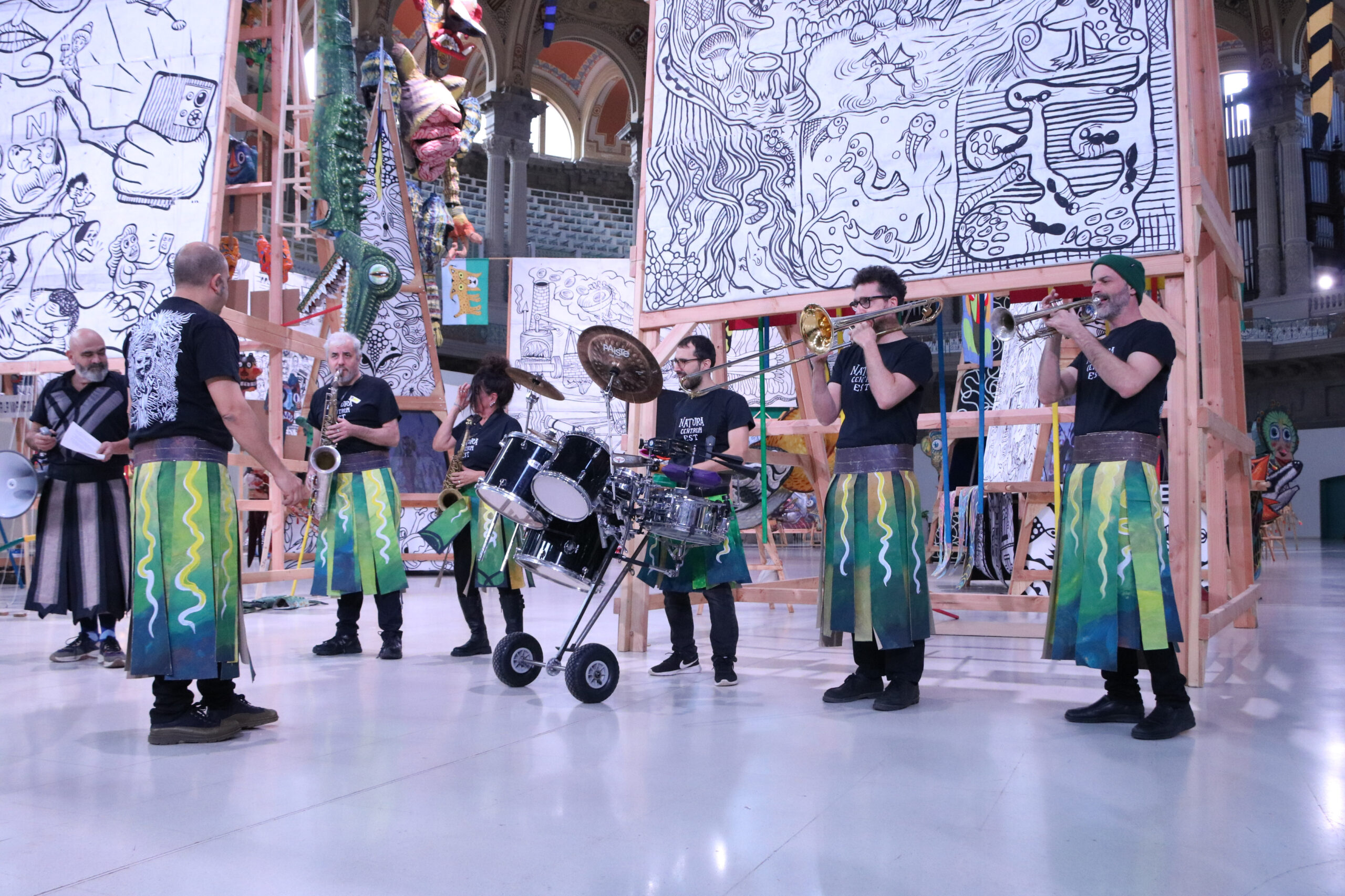‘Natura Centrum Est’ es configura com un campament pel qual el visitant podrà deambular a través de telons i objectes —cartells, figures de gran format, dibuixos i pancartes— construïts per una desena de col·lectius, entre els quals hi ha associacions de veïns, grups de folklore, escoles d’art i persones vulnerables. Per això, l’autor reivindica que la mostra “ha estat concebuda com una obra una compartida”, malgrat que l’origen de cadascuna de les peces no fos aquest.