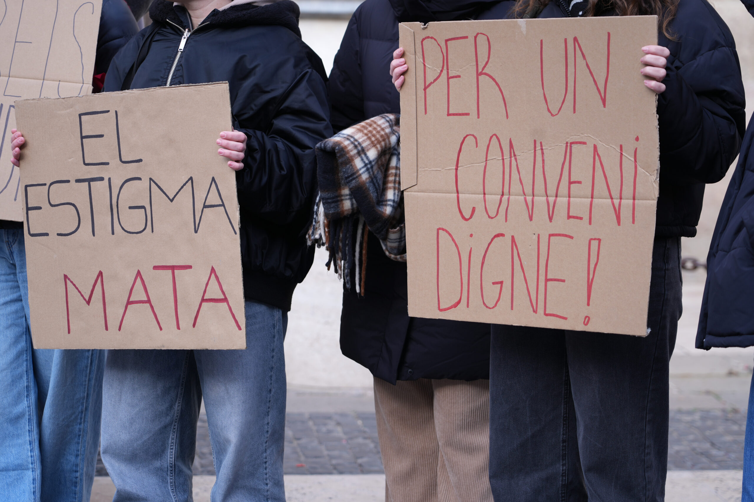 La concentració s’ha fet a la plaça Sant Jaume de Barcelona i ha agrupat diverses persones que han vingut amb pancartes i cartells. En aquestes es podien llegir missatges com ‘Vocació no és explotació’, ‘Treball digne’, ‘Més drets i menys prejudicis’ o ‘L’estigma mata’.